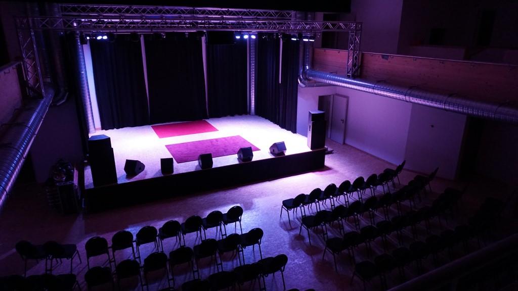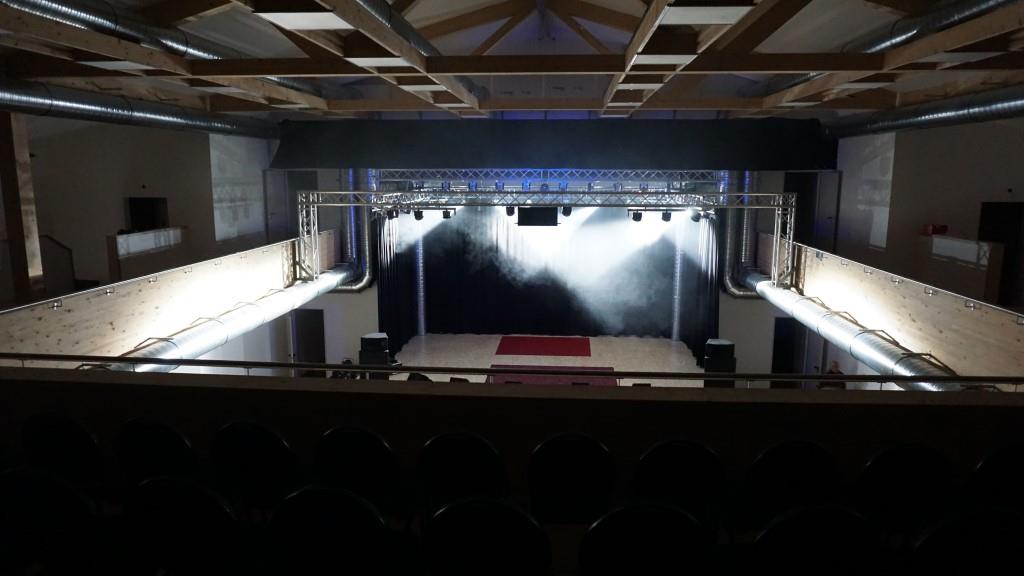 Im Erdgeschoss befindet sich eine Bühne von 6 x 8 Meter, die bei Bedarf durch Podeste vergrößert werden kann. Abhängig von der Bestuhlung haben die bis zu 600 Zuschauer verteilt auf Erdgeschoss und Galerie im Obergeschoss einen wunderbaren Blick auf die Bühne.